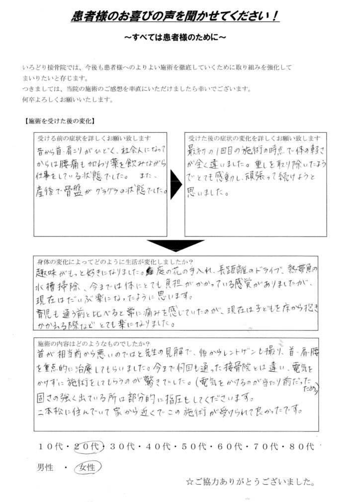 昔から首・肩こりがひどく、社会人になってからは腰痛も加わり薬を飲みながら仕事をしている状態でした。また、産後で骨盤がグラグラの状態でした。