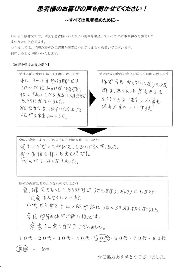 年に3~5回ギックリ腰になり3日~5日位歩けない時があり、イスにすわってくびを左右にふるだけでギックリになっていました。
