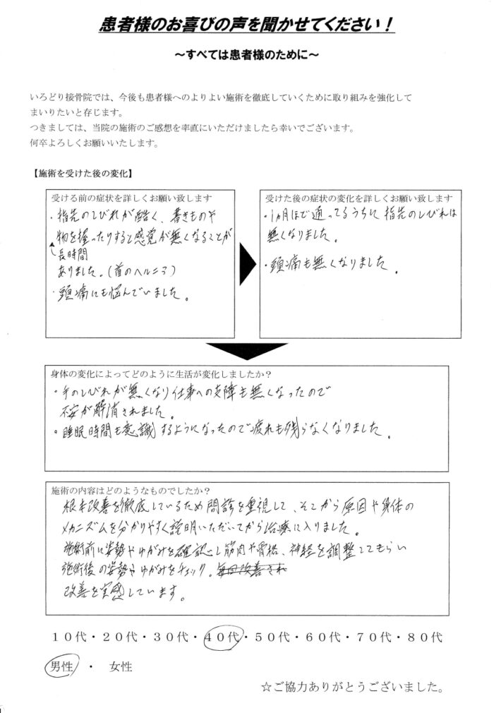 ・手のしびれが無くなり仕事への支障も無くなったので不安が解消されました。