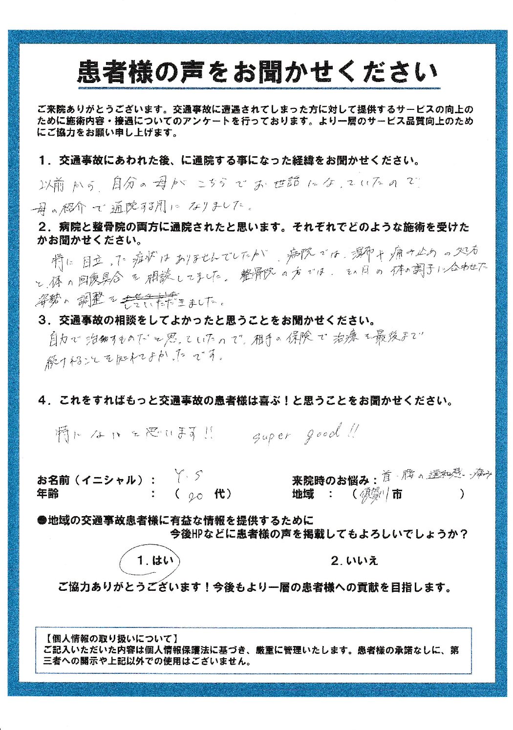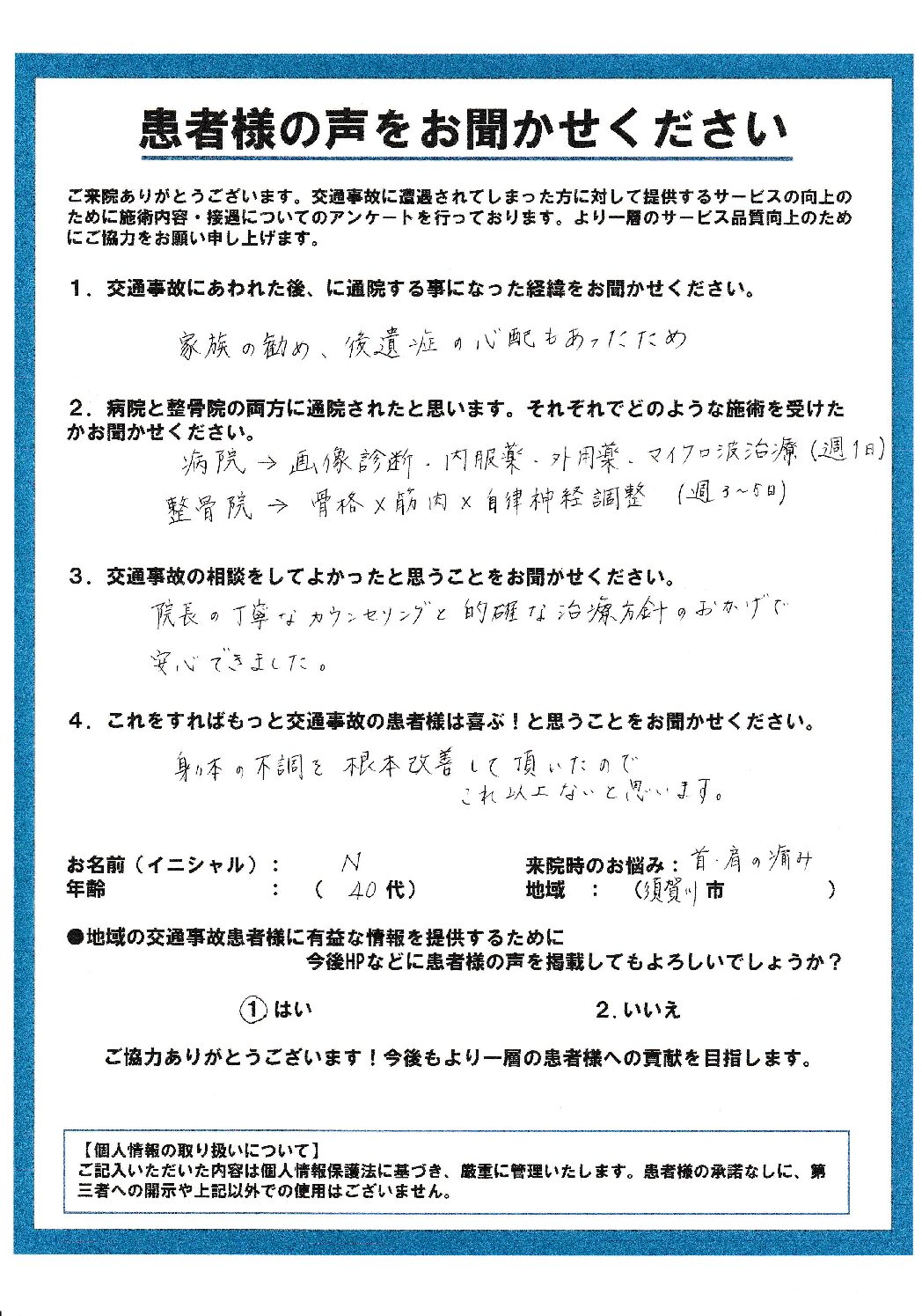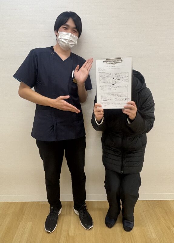 痛み等がなくなり、今後は、予防のための施術をしていただけるということで、痛み等が再発しないように気をつけるとともに、治療から予防とよりそってくださり、ありがとうございました。今後ともお世話になります。