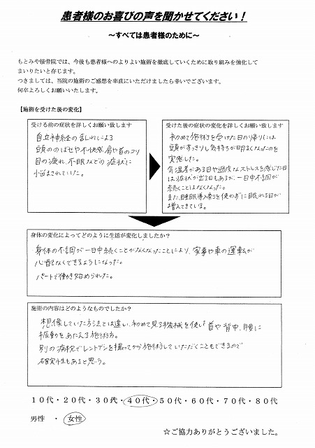 仕事中、体の痛みや頭痛などが時折あったが、施術を受けてからは頻度が大分少なくなった。