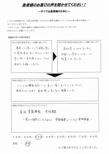 昔から首・肩こりがひどく、社会人になってからは腰痛も加わり薬を飲みながら仕事をしている状態でした。また、産後で骨盤がグラグラの状態でした。