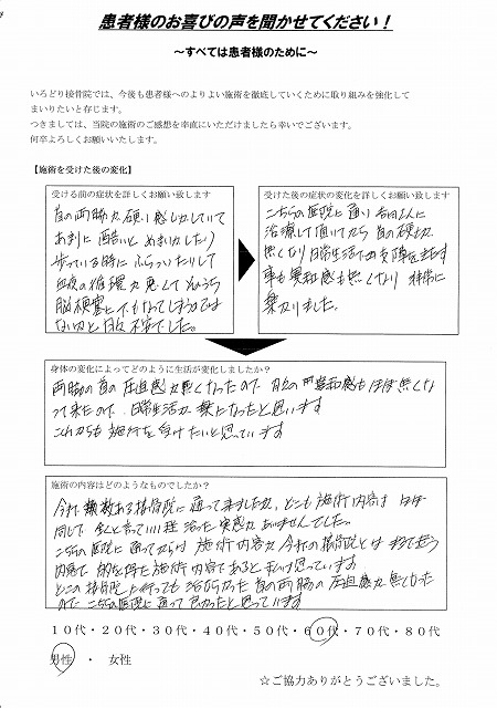 両脇の首の圧迫感が無くなったので、日々の違和感もほぼ無くなってきたので、日常生活が楽になったと思います。