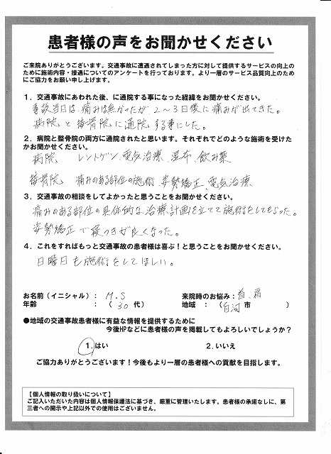 事故当日は痛みは無かったが、2~3日後に痛みが出てきた。