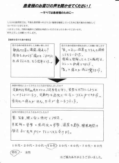 首周辺の痛みが消え、生活が楽になりました。