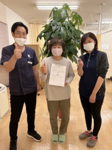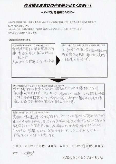 2.3ヶ月たった頃、首の痛みが軽くなり、夜は寝返り出来、歩き方も見栄えできる様になりました。