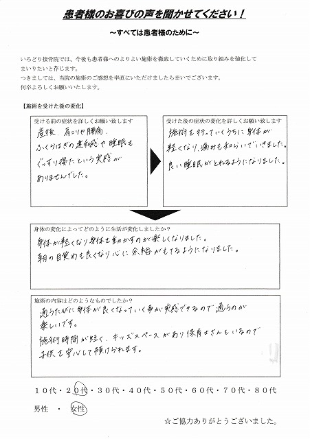 産後、肩こりや腰痛・ふくらはぎの違和感や、睡眠もぐっすり寝たという実感がありませんでした。