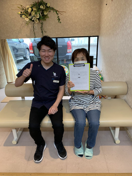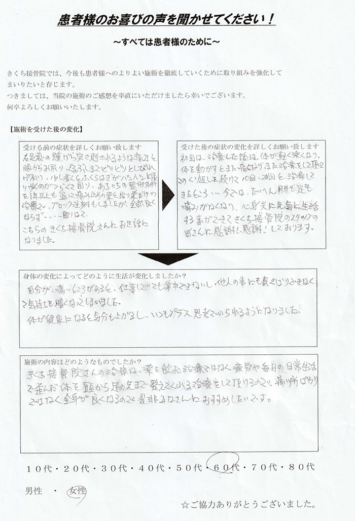 初回は、治療した後は体が軽く楽になり、体を動かすとまた痛くなり、また治療をして頂いて、この繰り返しを続けて、10回、20回と治療してきたところ…、今ではたいへん腰も足も痛みがなくなり、心身共に元気に生活することが出来て、きくち接骨院のスタッフの皆さんに感謝!感謝!しております。