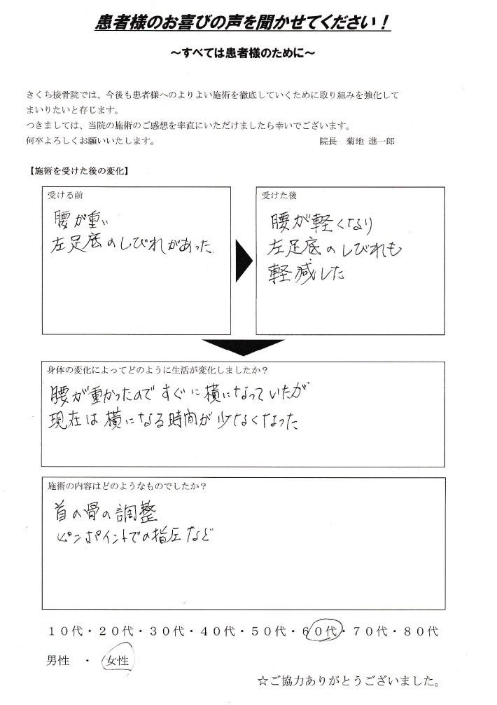 腰が重かったのですぐに横になっていたが、現在は横になる時間が少なくなった。
