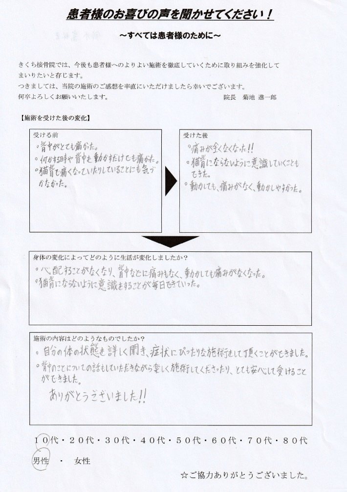 - ・心配することがなくなり、背中などに痛みもなく、動かしても痛みがなくなった