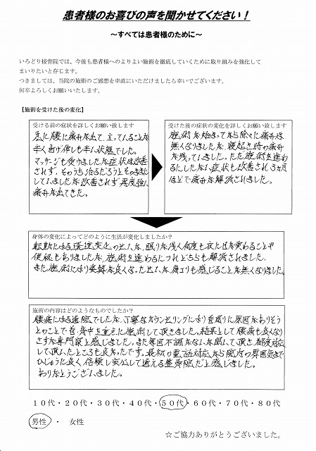 腰痛による通院でしたが、丁寧なカウンセリングにより首回りに原因がありそうとのことで、首・背中を重点に施術して頂きました。